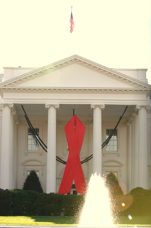 十一月三十日,美国白宫的北门厅入口处悬挂起红丝带。红丝带是艾滋病防治的象征。自二○○一年至今,美国国内用于艾滋病治疗及护理的费用已超过八百九十亿美元。(新华社发)