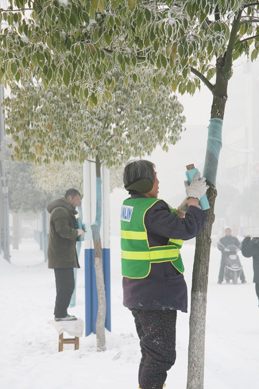 昨日,市风景园林管理局职工为城区树木进行“保暖”。(樊友刚摄)