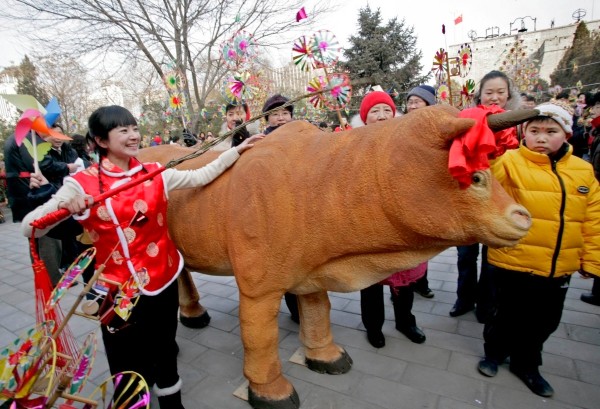 2月4日,一位市民体验“鞭春之礼”。当天是立春,一场“鞭打春牛”民俗活动重现北京古观象台。人们用柳条制作的鞭子鞭打道具牛,期盼新年风调雨顺、五谷丰登。 (新华社发)