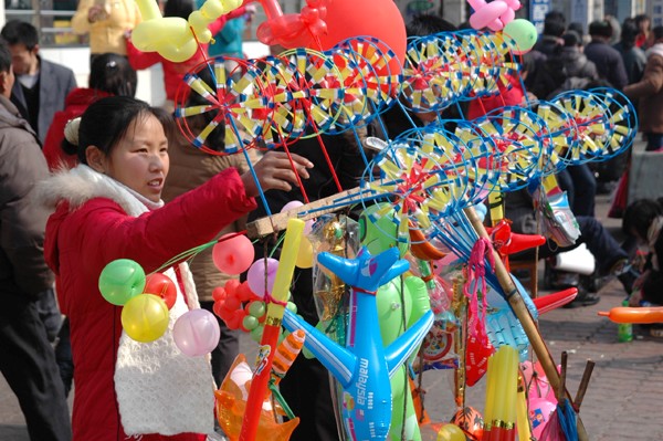 新春佳节,传统的风车在市场上十分抢眼,成为孩子们的玩物。(本报记者 陈德友摄)