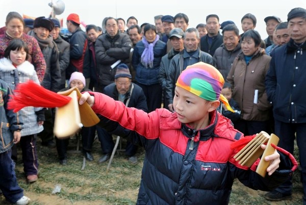 2月19日,一位小艺人在为观众表演快板书。当日是农历正月十三,来自全国各地的上千名曲艺艺人,负鼓携琴,来到河南省宝丰县马街村,在数十公顷的书会会场上亮书献艺,前来听书的群众达几十万人,场面十分壮观。