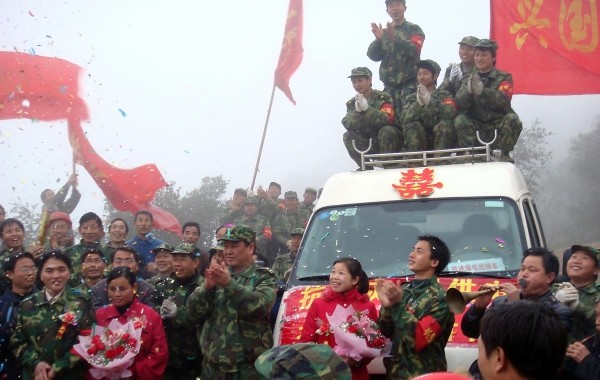 2月19日,在江西兴国县谷树庵山上电塔下举行的婚礼上,两对新人接受众人的祝福。今年年初,兴国县遭受冰冻雨雪灾害,兴国县南坑村民兵姜景旺、刘庆双双推迟婚礼参加电网抢修。2月16日,南坑村终于通了电。乡亲们得知情况后,在一座刚刚修好的电塔下为他俩置办了热闹的婚礼。 (新华社发)