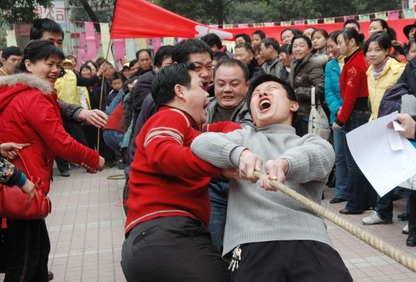 2月20日,农民工参加拔河比赛。当日,湖北省宜昌市举办农民工闹元宵专场游园会,来自宜昌市厂矿企业的近600名农民工代表参与了拔河比赛、舞龙灯等14个项目,欢庆元宵佳节。 (新华社发)