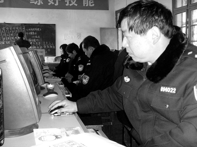 新春伊始,曾都区职业高中义务为北郊派出所干警开办计算机培训班,帮公安干警们充电。图为干警们学习时的场景。