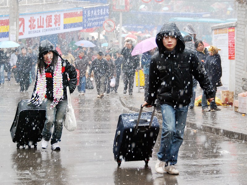 2月25日,乘客冒雪到宜昌火车站乘车。当日,湖北宜昌再次遭遇大雪袭击,气温骤降。目前,从宜昌始发到各地的列车均有票可售。 (新华社发)