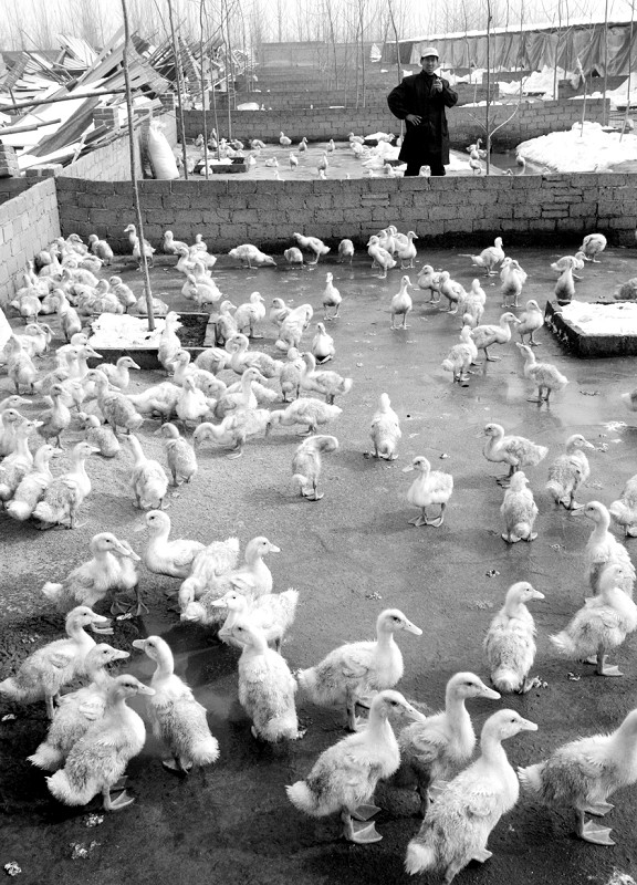 前段时间的雪灾给随州市新欣农牧有限公司造成了三百多万元的经济损失。该公司不等不靠,积极抗灾自救,及时恢复种鸭养殖,力争把灾后的损失降到最低点。图为该公司南郊种鸭养殖场一角。 (本报记者 孙洪涛摄)