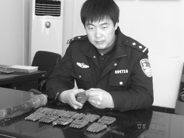 3月1日,曾都区吴山镇金成村七组田海忠在宅基地上挖树窝栽树时,从老屋的墙脚里挖出军用子弹58发,手榴弹一枚,主动上交派出所。图为民警在整理子弹、手榴弹的情景。 (徐军国 魏冬明 摄)