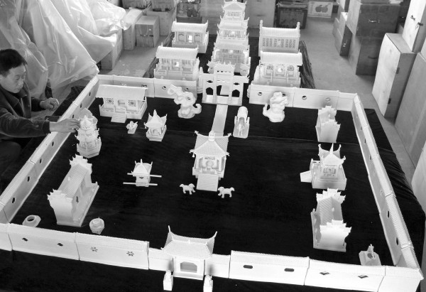 3月8日,江西景德镇陶艺家罗冬根展示瓷器群雕《大观园》的局部。罗冬根是一名红学爱好者,他从2002年开始制作瓷器群雕作品《大观园》。