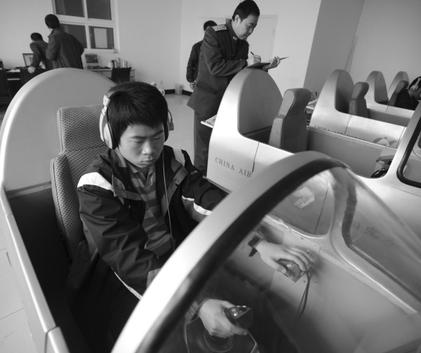 3月8日,参加选拔考试的学生在模拟驾驶舱内考试。当日,空军招飞局兰州选拔中心开始招收飞行员,吸引了来自甘肃、陕西等地的大学生和高中生前来报名应试。 新华社发