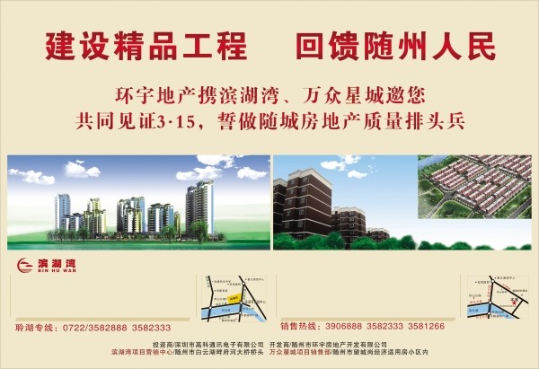 为响应党中央号召,构建和谐社会。确保随城中低收入家庭户户享有住房,破解普通百姓住房难题,环宇地产在市委、市政府大力支持下,倾力打造随州最大限价房、廉价房、经济适用房项目。