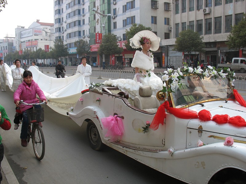 三月十日,一名女模特身穿三十米长的拖尾婚纱站在婚礼车上巡游街头,吸引年轻人驻足观看。这是随州城区一家婚纱影楼专程从上海引进的厚版高档婚纱