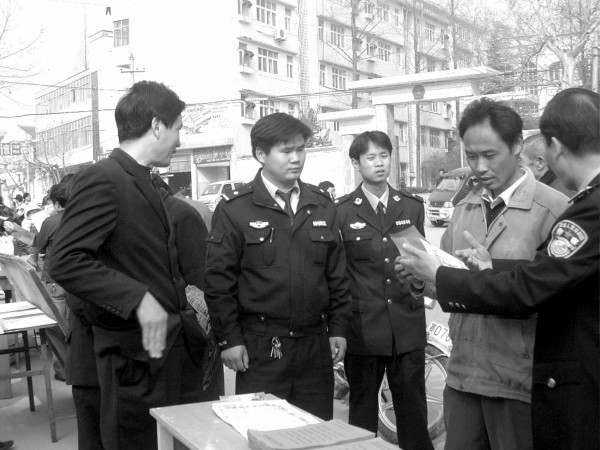 曾都区三里岗派出所联合洪山交警中队,深入街道、村湾开展交通与治安管理法规宣传。图为他们发放宣传资料,现场解答群众咨询。 (唐德勇 摄)
