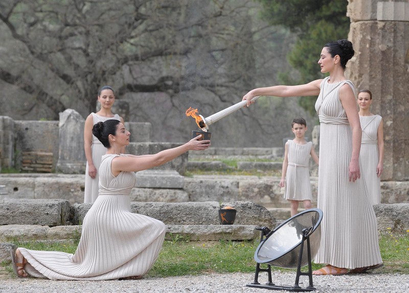 3月24日,北京奥运会圣火取火仪式在希腊奥林匹亚举行。图为扮演最高女祭司的玛利亚·娜芙普利都(前右)点燃火种罐。