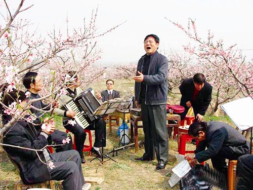 近日,广水市蔡河镇二十里铺的桃花园内,器乐声声,歌声阵阵。广水市戏曲协会会员在这里举办踏青歌会。来自该市新老戏曲文艺爱好者欢聚在这里,观赏桃花,以歌会友。 (本报记者 宋俊超 通讯员 易小辉摄)