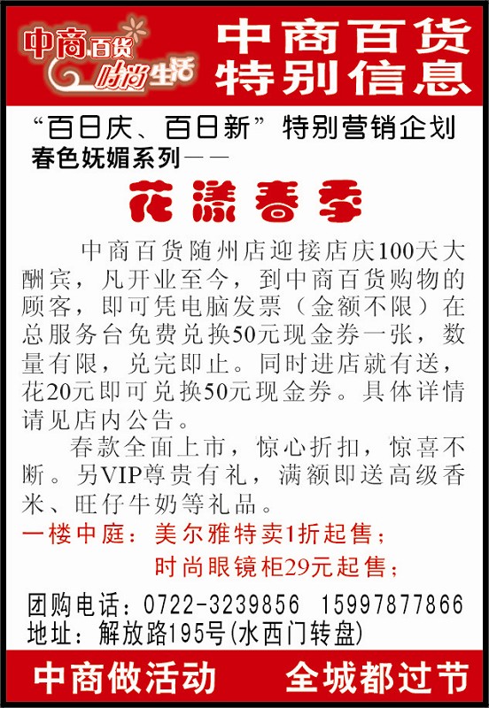 请持购物券的顾客4月30日前到购物中心财务部兑换面值卡,逾期购物券不再使用