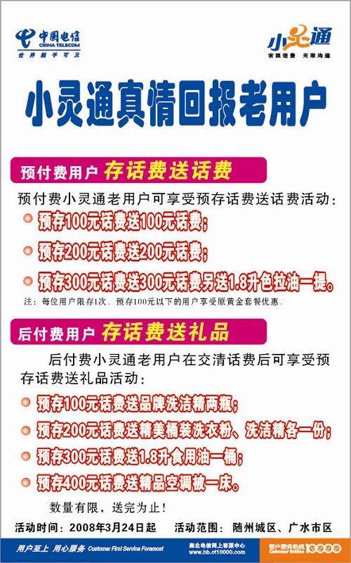 即日起,50元入网送2.5L食用油一提或精品汤锅一个;100元入网送5L食用油一桶或高档 “美的”炒锅一个。数量有限,先到先得,送完为止。购任意C网手机即送400元话费(200元一次到账,另200元分10个月到账)。办理地点:联通营业厅。