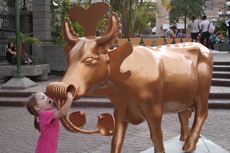 3月27日,在哥斯达黎加首都圣何塞市中心街头,一头彩绘牛吸引了小朋友的目光。当天,彩绘牛展在圣何塞开幕。这些与真牛一样大小的艺术牛由玻璃纤维制成,五彩斑斓,形态各异。 (新华社发)