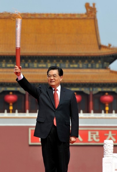 中共中央总书记、国家主席胡锦涛在仪式上亲手点燃圣火盆,并宣布北京2008年奥运会火炬接力开始。