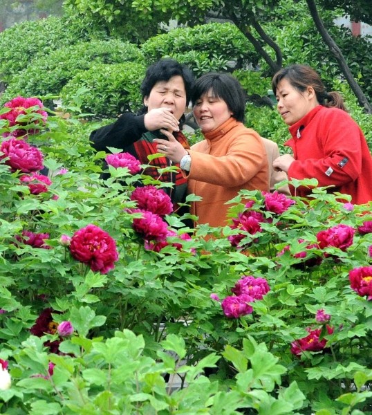 4月1日,几位游客在欣赏自己拍摄的牡丹花照片。当日,第26届洛阳牡丹花会赏花启动仪式在洛阳市王城公园举行。1200多个品种、4000万株雍容华贵、芳香四溢的牡丹,吸引了八方游人。 (新华社发)
