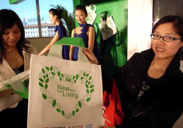 4月2日,“环保新生活”环保购物袋义卖活动在北京启动。此次环保公益活动倡议公众使用布袋购物,抵制使用造成白色污染的一次性塑料袋。图为一位市民在北京新世界商场购买可循环使用的环保购物袋。 (新华社发)