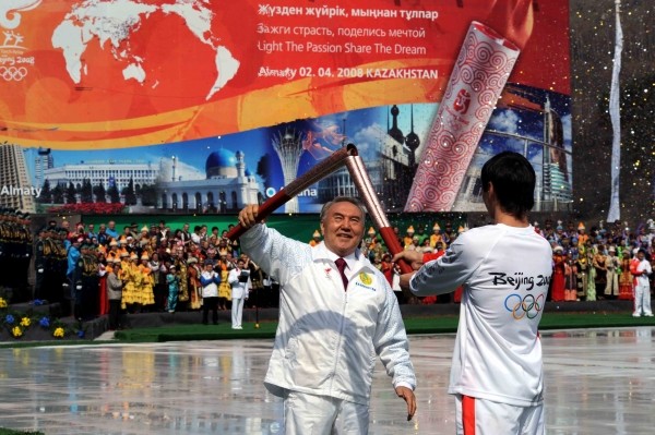 身着白色运动装的哈萨克斯坦总统纳扎尔巴耶夫出席开幕式并简短致辞。随后,他从中国驻哈萨克斯坦大使张喜云手中接过火炬,右手高举向全场展示并跑出起点,成为此次奥运圣火境外传递的第一人。