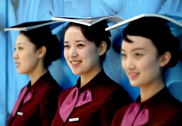 4月3日,沈阳桃仙国际机场几位员工正在进行奥运礼仪培训。近日,一些服务行业的单位在员工中开展“奥运服务我添彩”主题活动,倡导举止端庄、谈吐温和、着装整齐等10种文明行为。 (新华社发)