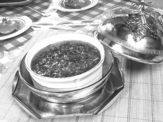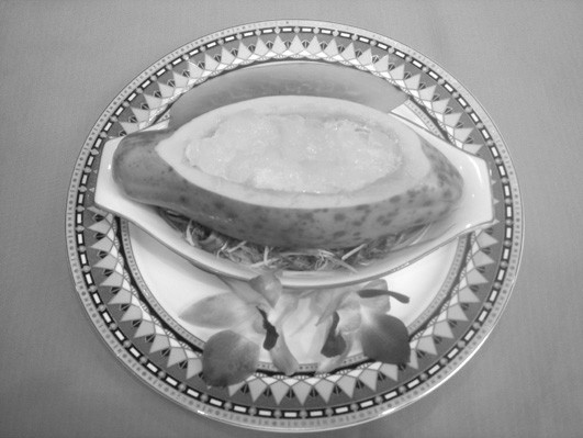 (2)海参丝、金元鲍丝,鳘肚丝加姜汁20g焯水,起锅放上汤650g,加入鱼翅、鲍、参、肚丝,加盐3g、味精1g、鸡粉1g,试味后勾芡,撒胡椒粉即成。