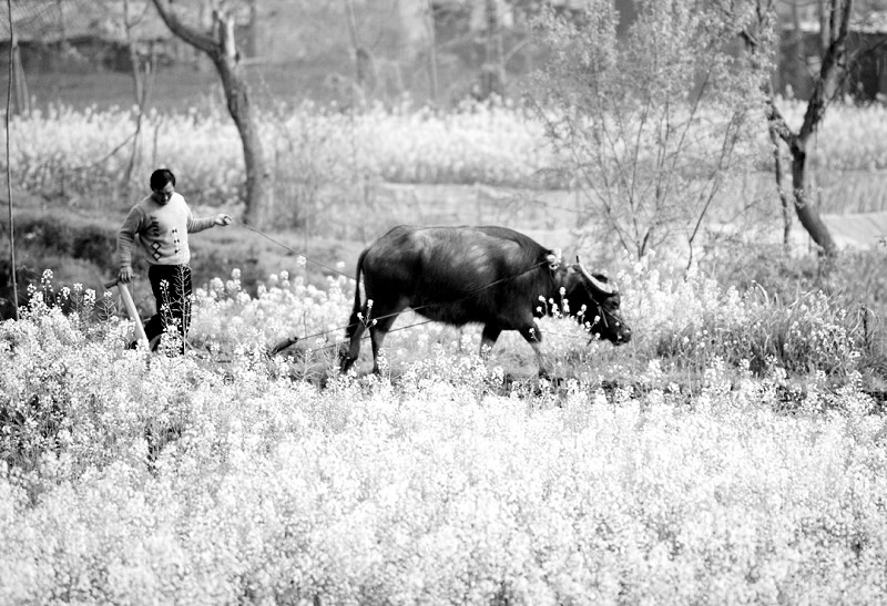 四月四日,曾都区南郊农民正利用晴好天气耕种生产。金色的油菜花和劳动的农民构成了一幅优美的春耕图。(本报记者孙洪涛摄)