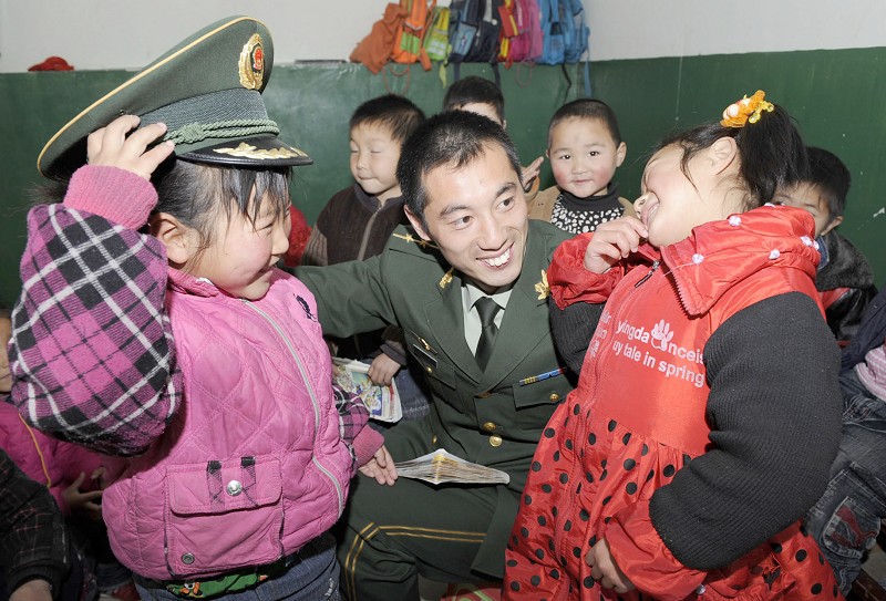 出生于1981年的吕健2005年大学毕业后来到地处黄河入海口的山东东营广利边防派出所,担任一名普通的 “片警”。在工作中,他结合渔民村特点,不断创新工作方法,成为辖区百姓的“贴心人”。日前,27岁的吕健被辖区村民选举为广利港社区副主任。图为吕健(中)在村里的寄宿幼儿园看望小朋友。 (新华社发)