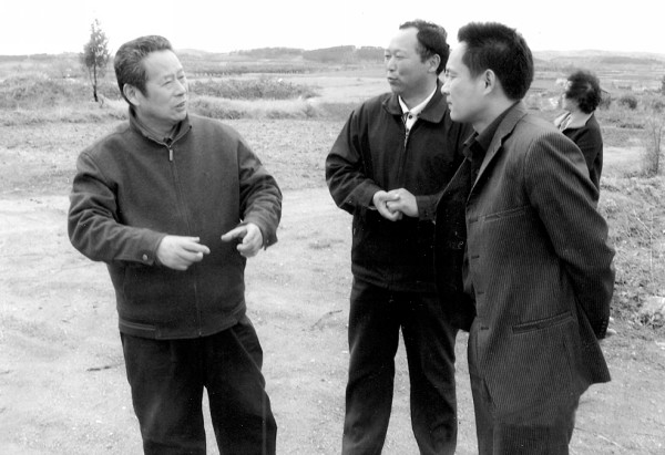 四月八日,湖北省老区建设促进会会长吴华品(左一)等,来到省老促会联系点曾都区吴山镇山丰村,指导科学种植优质果树。(石守京摄)
