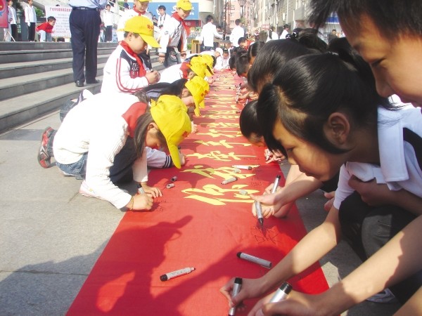 四月二十九日,广水市应山城区六所中小学校两千余名师生代表城区万余师生在印台山广场庄严宣誓,并在“争创省级卫生城市,规范中小学生文明卫生行为”的红色条幅上签名。本报记者 毛传荣通讯员 鹏程、建军摄