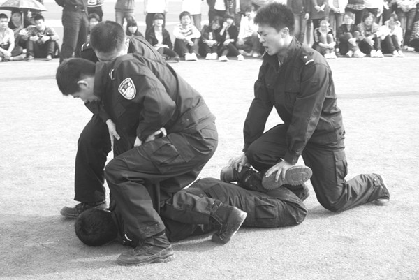 近日,为提高学生们的安全意识,随州市公安局特警支队来到随州职业技术学院,对学院师生进行安全防爆演示。图为演示现场。(通讯员 程昆 张亦飞摄)