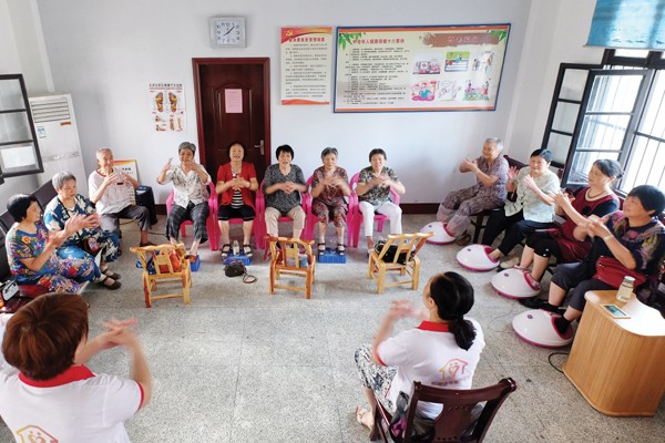 7月21日早晨,曾都区东城办事处文峰塔社区的老人们在社区工作人员的辅导下,一边理疗,一边做健康穴位操。该社区设立场地,为居民免费提供文体、健康及居家服务,使社区成为居民的共同乐园。 (本报记者 李文军摄)