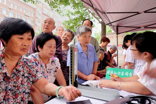 曾都区东城卫生院认真落实“10万医生进百万家庭惠千万群众”活动。图为文峰塔社区卫生室为居民免费体检并提供健康知识咨询。 (本报记者 李文军 摄)