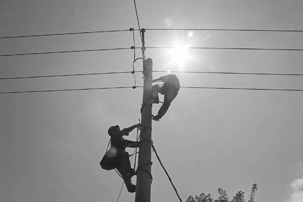 目前正值水稻抽穗用水高峰期,农村生活生产用电剧增。图为8月2日,随县新街供电所接到农民用电故障请求,迅速赶到姜湾村,冒着高温及时抢修故障线路。(记者 李文军摄)
