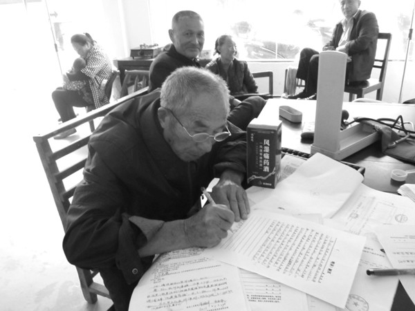 广水市城郊街道办事处星河村八十岁的居民杨仁杰“老骥伏枥,志在千里”,积极投身食品药品协管工作,图为他正在替群众写投诉材料。 (通讯员 李国明摄)