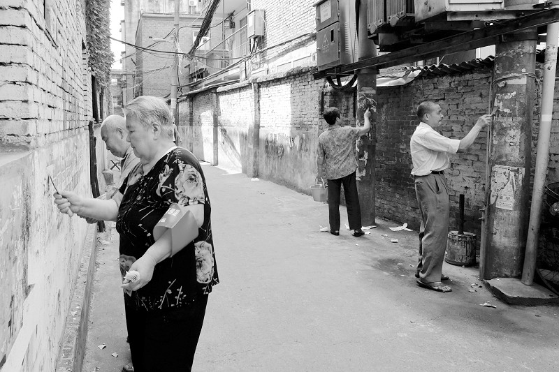 曾都区西城办事处玉波门社区退休老党员、老干部常年义务开展治安巡逻和卫生监督。图为老干部老党员在街头义务除“牛皮癣”。 (本报记者 李文军)