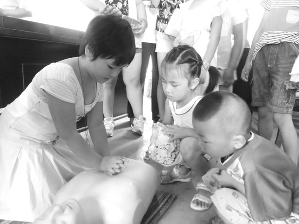 为增强农村留守儿童及其监护人的安全意识和自护能力,共青团曾都区委邀请武汉市生命阳光公益救援中心开展“希望伴飞”——未成年人安全教育活动,为留守儿童进行防溺水及交通安全、防火安全知识讲座,帮助留守儿童度过快乐、安全的暑期生活。图为在曾都区府河镇骆家河村,生命阳光公益救援的特邀专家现场教授孩子心肺复苏术演练。
