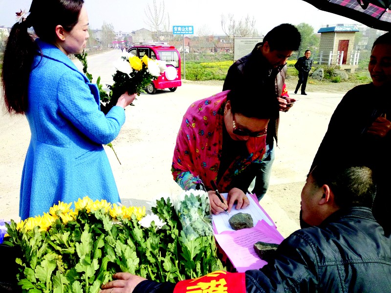 4月1日,随县安居镇街头,一名参与文明祭祖的居民(右二)正在镇政府设置的鲜花兑换点登记领取菊花。