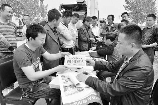 随州高新区淅河镇农机服务中心日前邀请曾都区农机局、曾都区农机安全监理站联合举办淅河镇农业机械现场免费年检,并为农机户办理农机跨区作业证,方便农机跨区作业。(本报记者 孙洪涛 通讯员 王涛 摄)