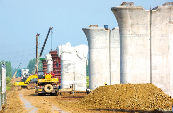武汉至十堰高铁随州—枣阳段正在加速推进。图为位于随县安居镇的涢水特大桥建设现场。 (本报记者 徐斌摄)