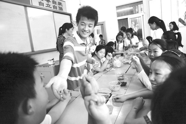 近日,曾都区东关学校与区特殊教育学校开展少先队员“手拉手”活动,图为两校同学同上一节手工课。 (本报记者 王璟天 摄)