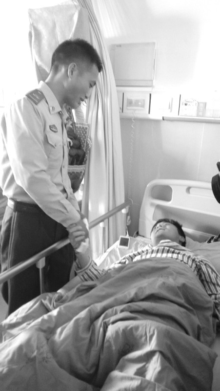 5月12日下午,被网友称为“刨土哥”的武警随州消防支队战士蔡伟,看望了5月9日因工地塌方被他现场救起的民工。(本报记者 周强 通讯员 方明华 摄)