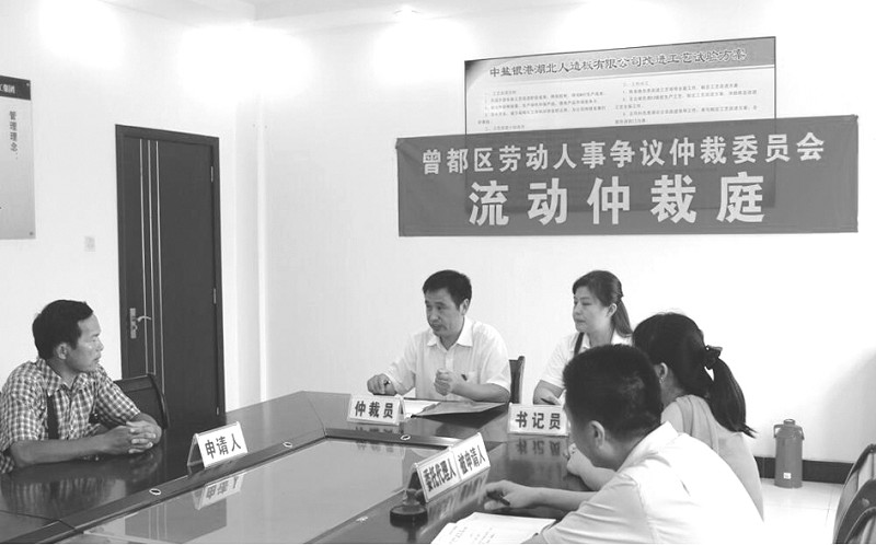 曾都区劳动人事争议仲裁委员会“流动仲裁庭”,现场开庭审理劳动争议案件。 (通讯员 屈真江 金红梅摄)