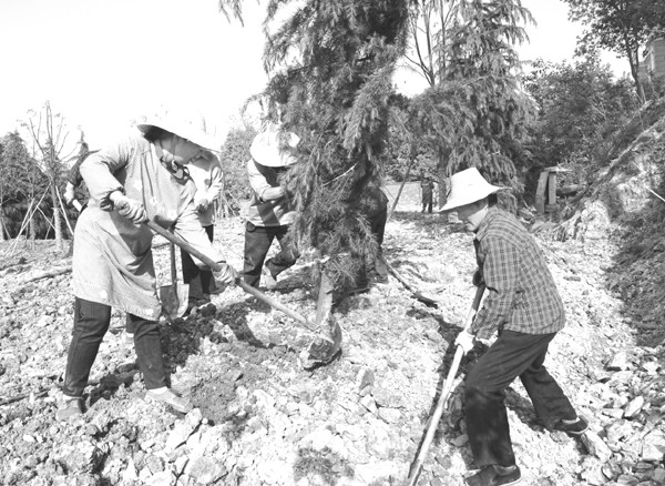 我市积极开展“绿满随州”行动,增加城市绿量,改善人居环境,图为白云大道旁的卫计委小游园工程建设现场,工人正在栽种松树。(本报记者王璟天摄)