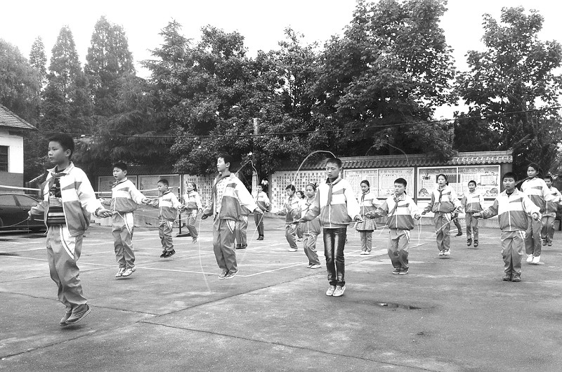 随县环潭镇涢阳小学着力打造书香校园的同时,注重丰富学生的课间活动。图为学生们正在练习花样跳绳。(通讯员 王春江 杨可云摄)