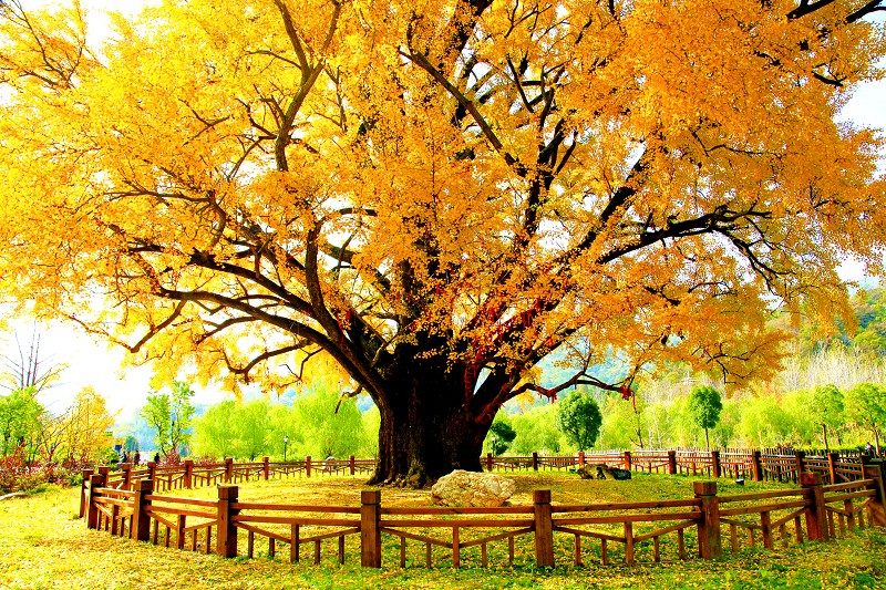 金秋,层林尽染,枫树、槭树披“红装”,栎树、银杏树换“黄衣”。野菊花一片片、一株株,黄橙橙,金灿灿,洒满山坡崖畔。到处野果累累,取之不尽。一年四季不变的松树、柏树等常绿树是所有色彩的背景色,而由白蜡、银杏、元宝枫、栎树、紫薇树等众多植物泼写的一簇簇火红,一团团暗黄,一块块浅白……各种色彩错杂其中,分外妖娆,构成一幅震撼人心、惊艳绝伦的美丽画卷。千年古银杏树下,宛如金色的海洋、梦幻中的童话世界。