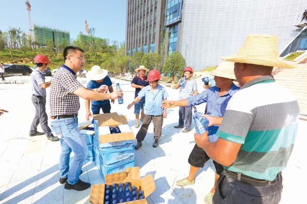 高温天气下,市城投公司20多个在建项目1000多名建筑工人坚守在城市建设一线,市城投公司要求各项目部采取错峰施工等多种措施防暑降温,在确保工人健康安全的情况下保证施工进度。图为7月29日,。 (本报记者 徐斌摄)