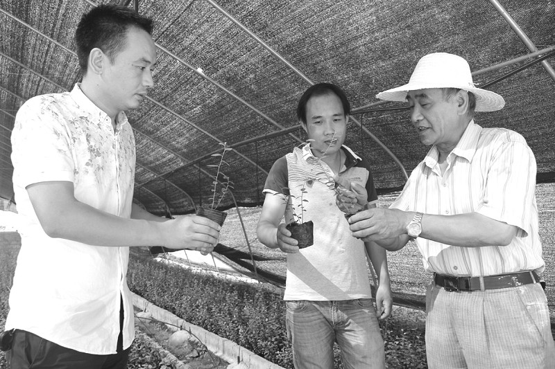 ▲一场特大暴雨,致使随州高新区一蓝莓园受损,近日,华农大教授魏端宏(右一)对蓝莓园进行科学补救措施指导,力争把损失降到最低。