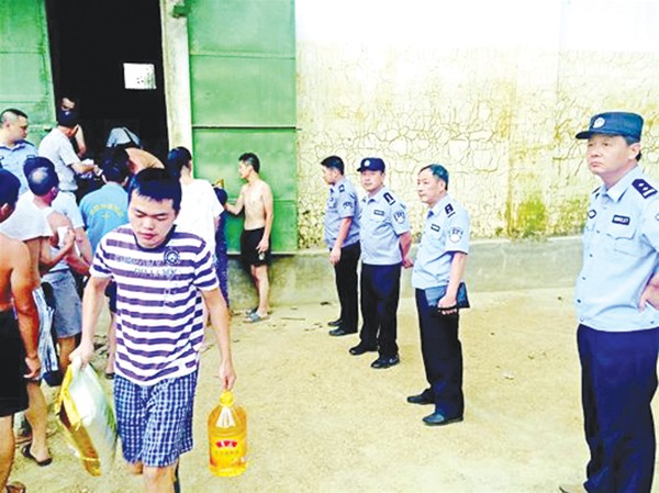 7月19日至20日,随州遭遇强降雨,曾都区府河镇青筑城村因暴雨和上游水库同时溢洪,导致河水暴涨受灾严重。洪灾过后,曾都区公安分局积极参与灾后重建及慰问工作。图为7月27日,曾都公安分局民警在曾都区府河镇青筑城村看望受灾村民,并维持救灾物资发放现场秩序。 (通讯员 宫思 佘敏摄)